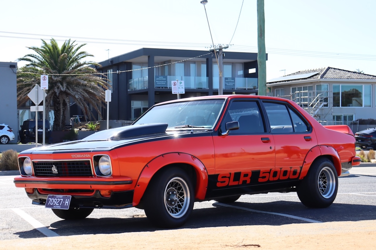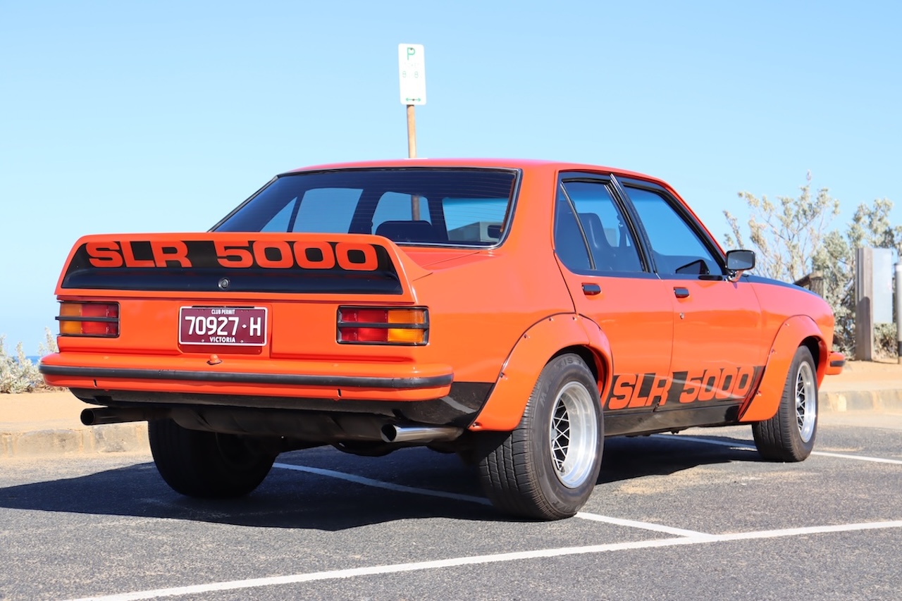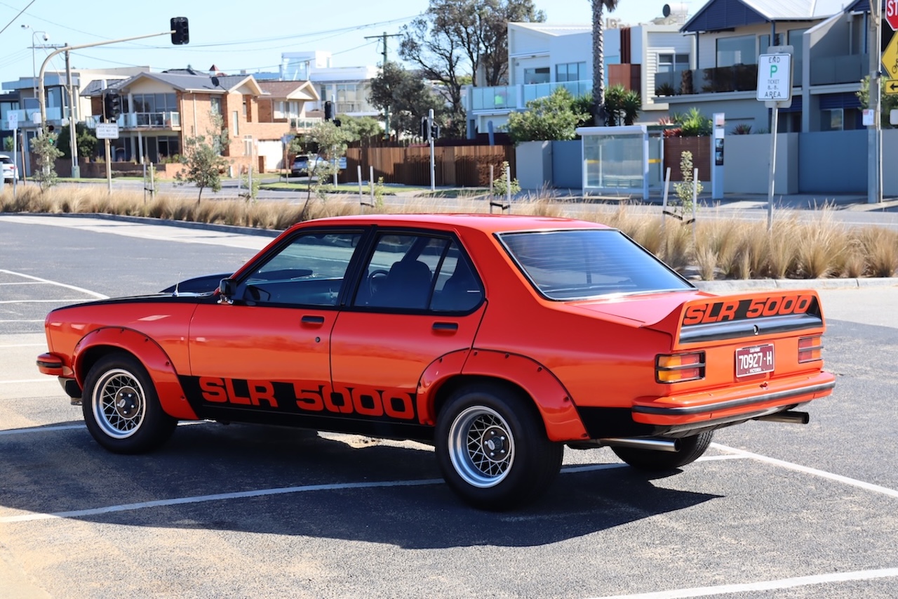 Genuine LX SLR5000 Torana Sedan finished in striking Mandarin Red with contrasting black trim.