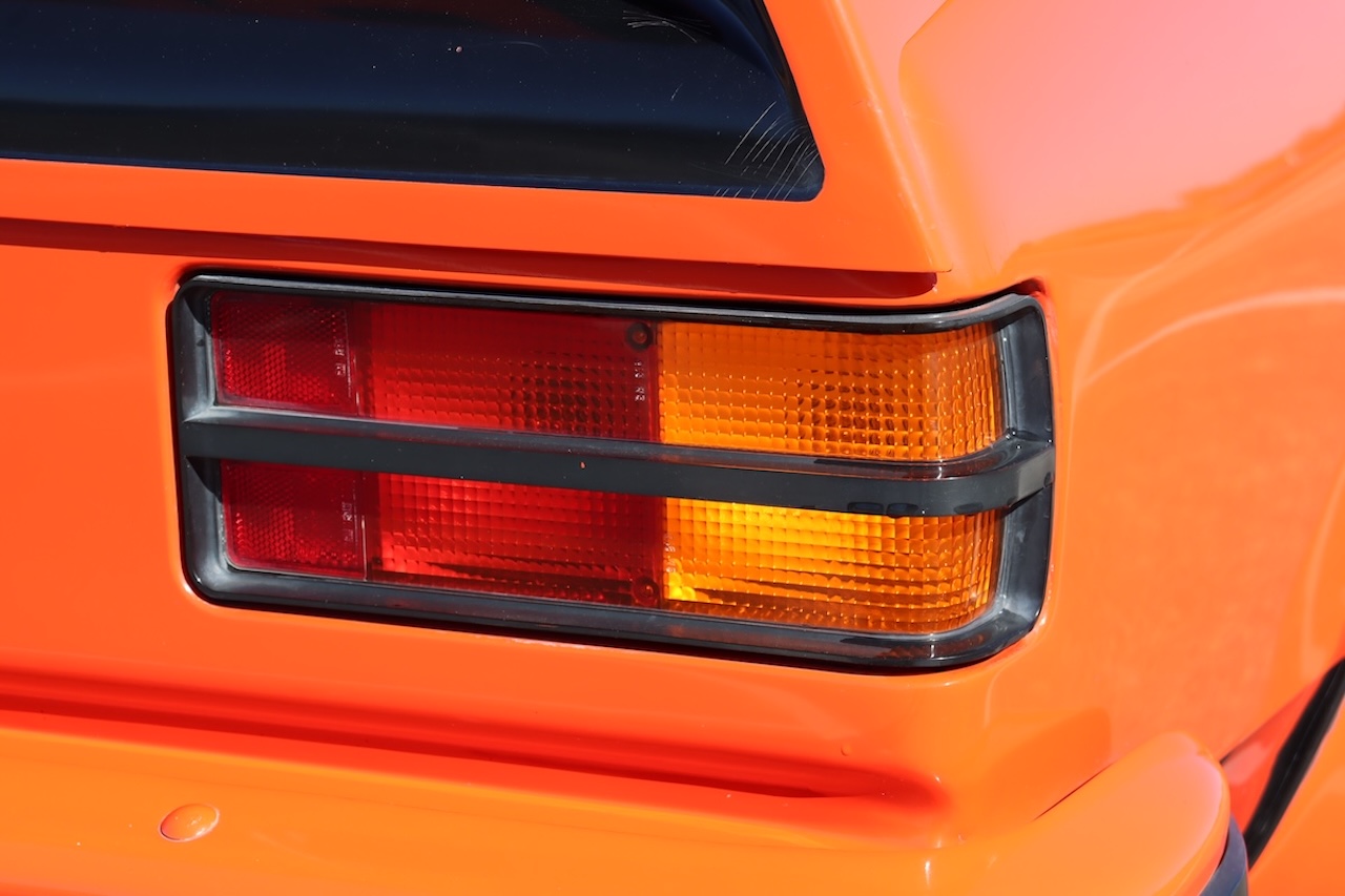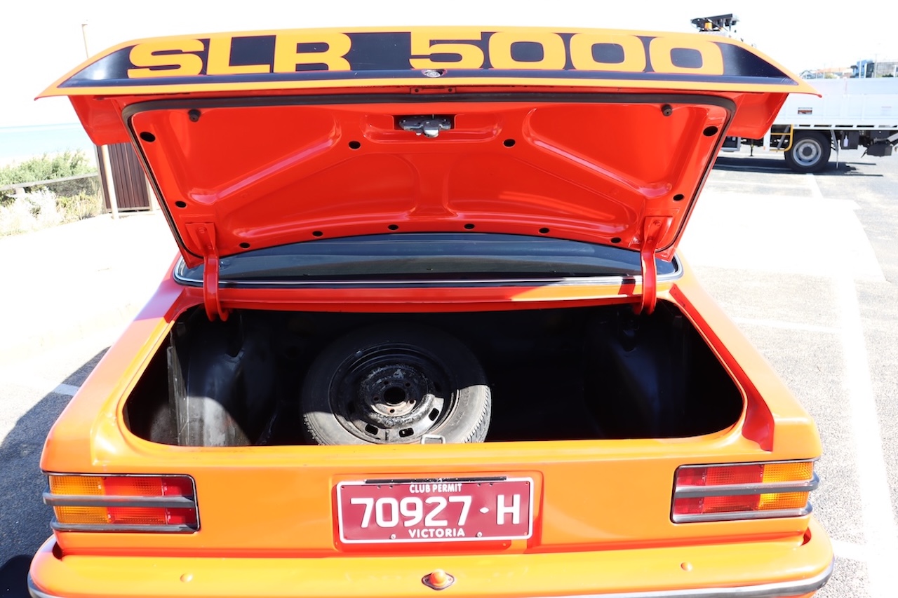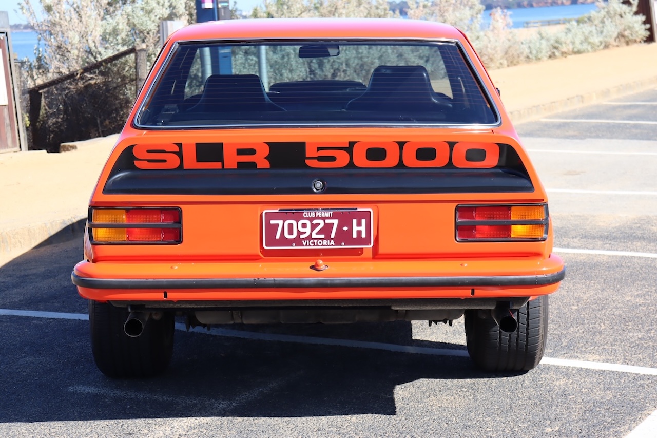 Genuine LX SLR5000 Torana Sedan finished in striking Mandarin Red with contrasting black trim.