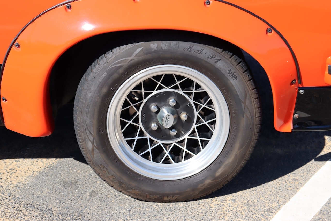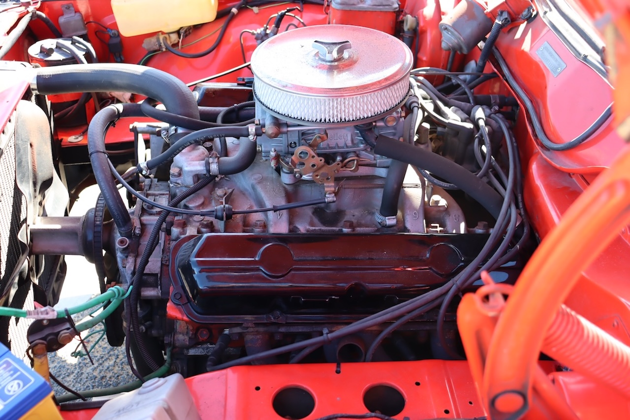 Transmission is handled by the factory M21 four-speed manual, and is riding on period correct genuine 14″ Cheviot Hotwire wheels